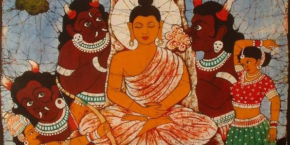 (Dibujo del Buda Sakyamuni a los pies del árbol Bodhi, rodeado de las tentaciones y los demonios de Mara)